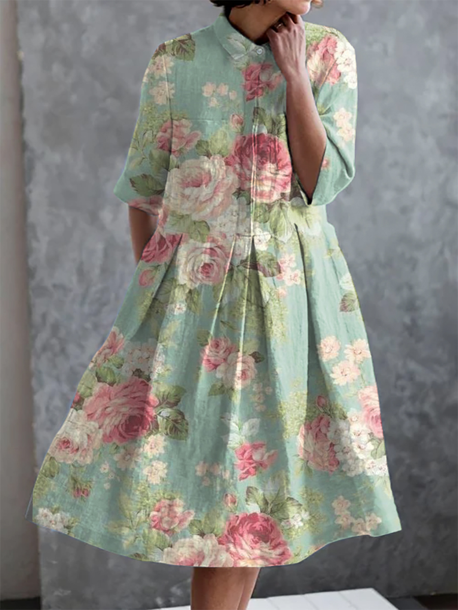 Retro Plant Print Casual Elegant Pocket Half Sleeve Dress