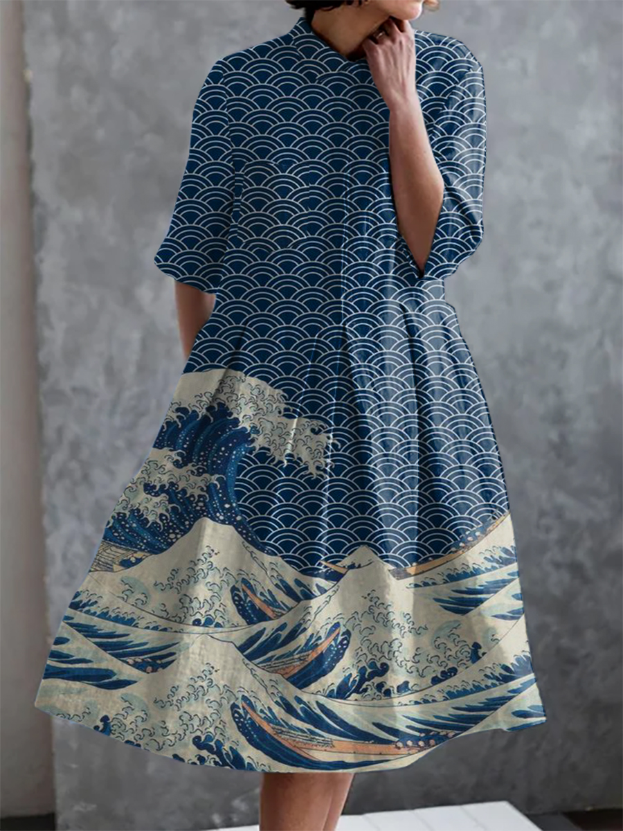 Japanese Wave Print Casual Elegant Pocket Half Sleeve Dress