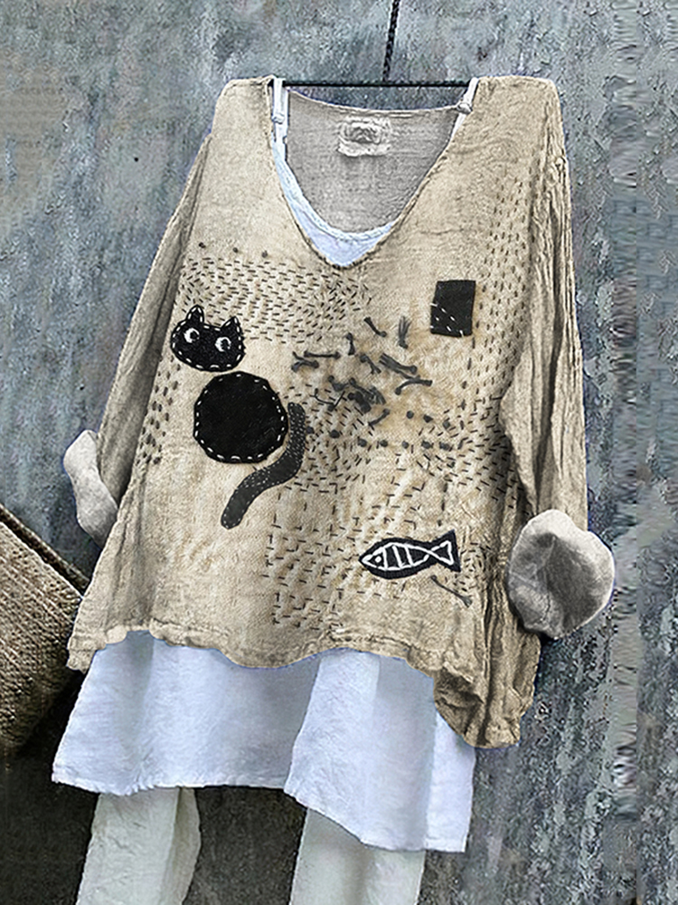 Vintage Abstract Cat Sashiko Art Linen Blend Blouse