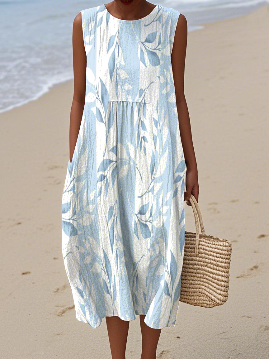 Women's Vintage Floral Pattern Art Print Sleeveless Cotton Pocket Wrap Dress