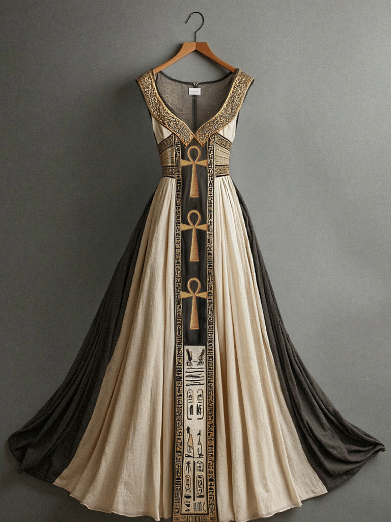 Ancient Egyptian Inspired Patchwork Linen Maxi Dress