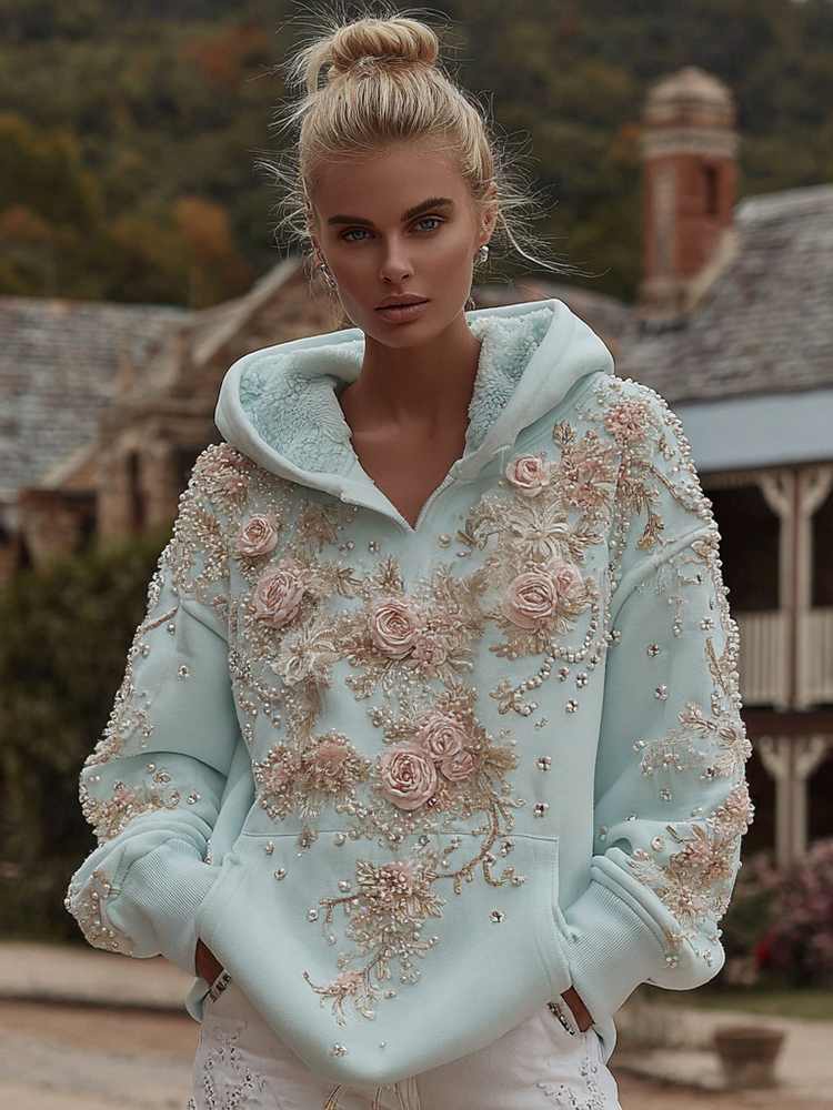 Women's Vintage Rose Pearl Embroidery Comfortable Warm Hoodie