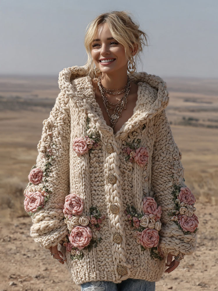 Women's Vintage Pink Floral Art Cozy Knit Hooded Cardigan