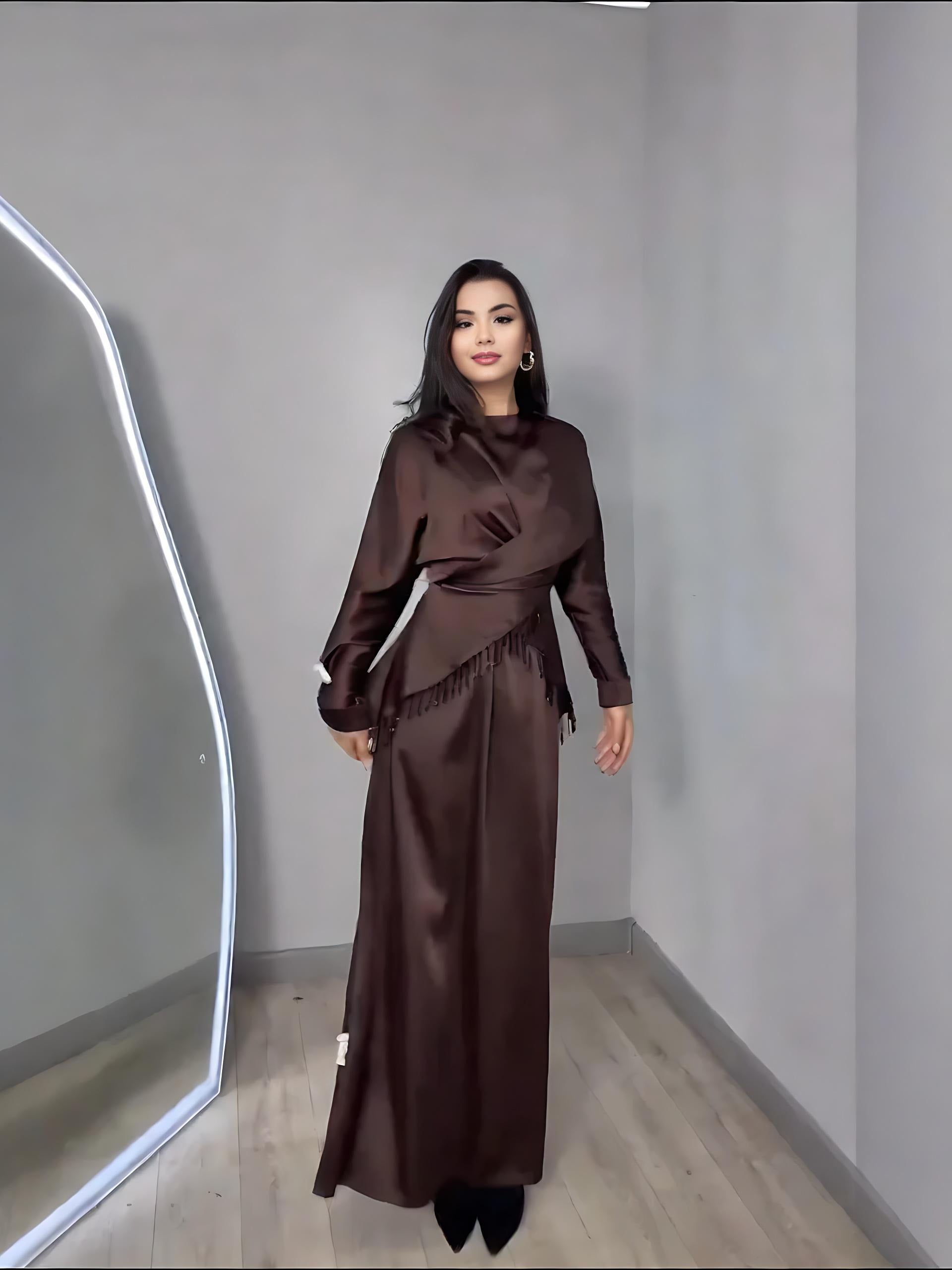Chocolate Satin Dress & Beaded-Fringe Overlay Set