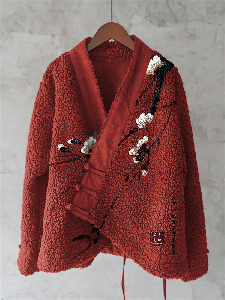 Japanese Plum Art Cozy Fleece Kimono Cardigan