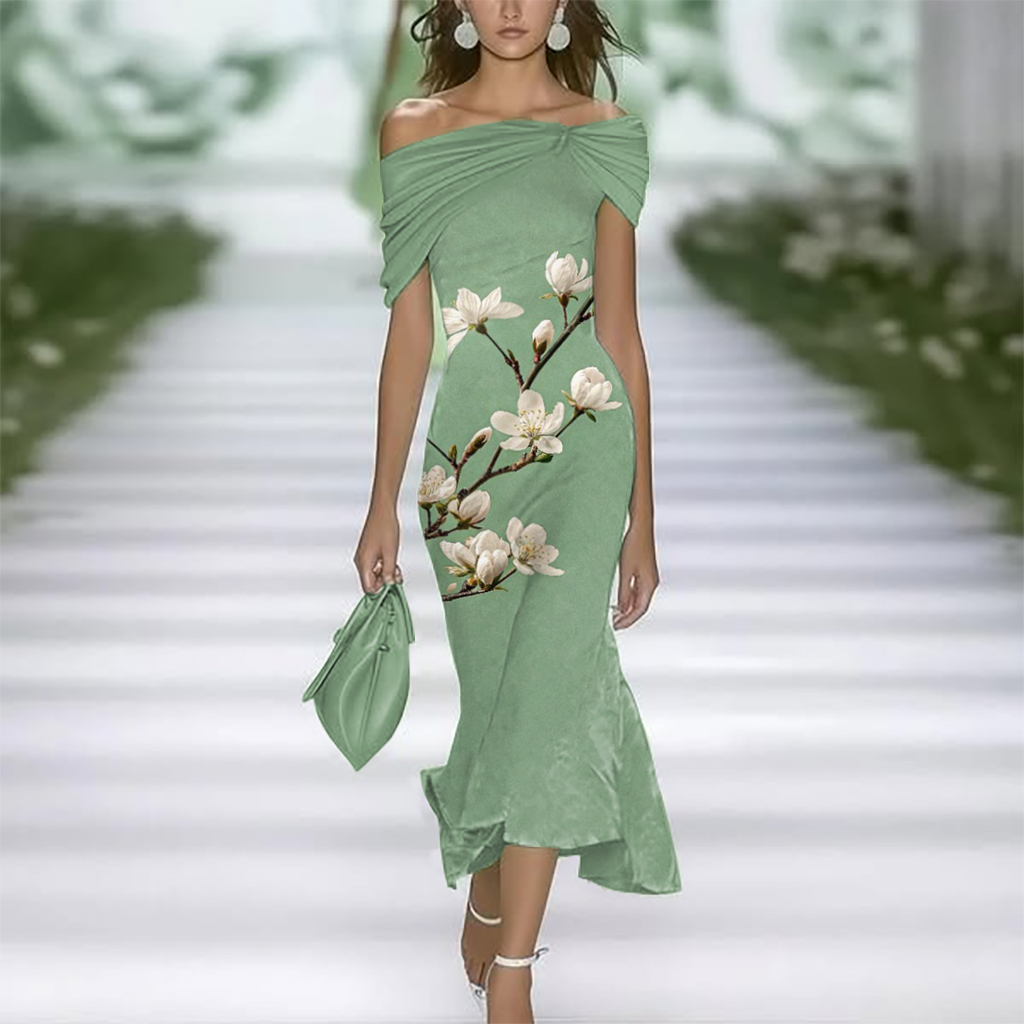 Elegant Spring and Summer Green Leaf Print Off-the-shoulder Dress