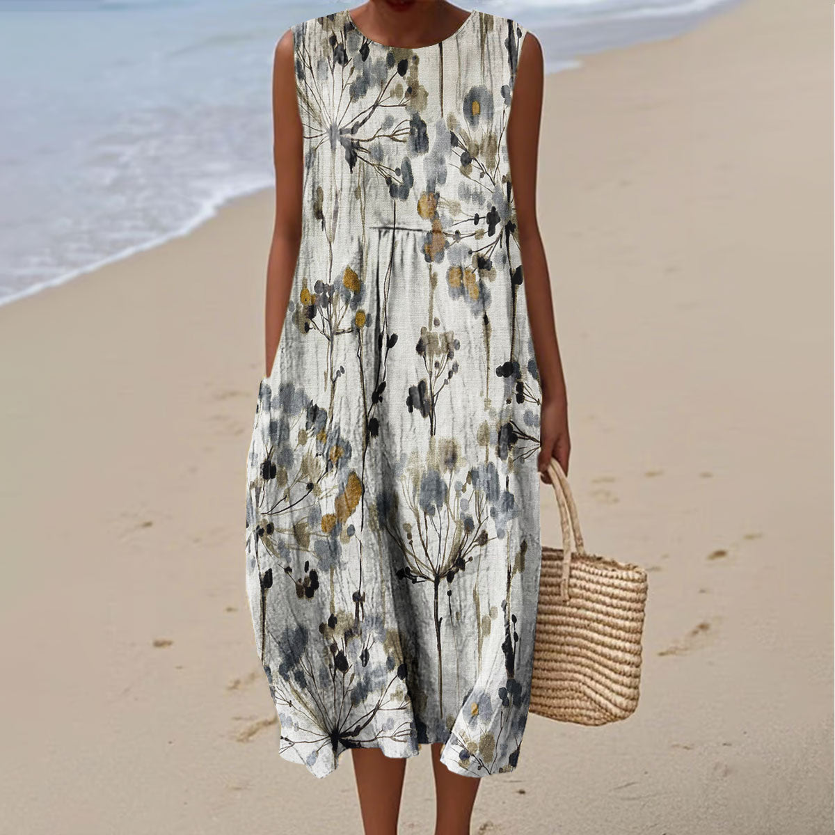 Women's Vintage Flower Art Print Sleeveless Cotton Pocket Wrap Dress