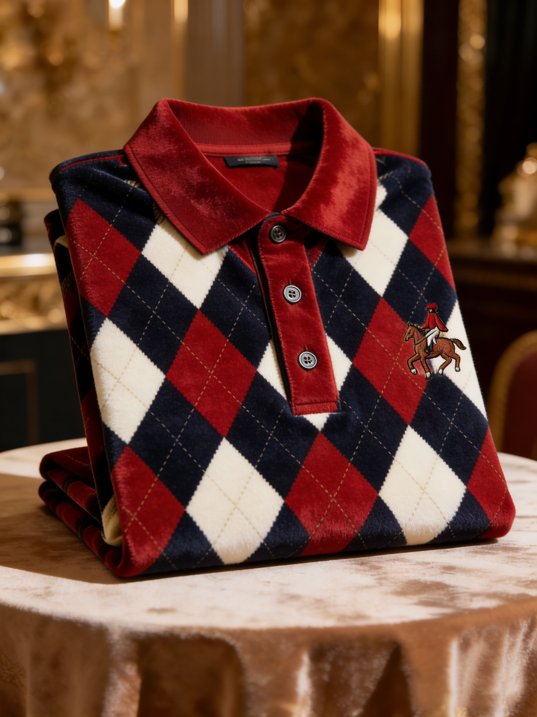 Men's Velvet Business Logo Print Long Sleeve Polo Shirt-0109