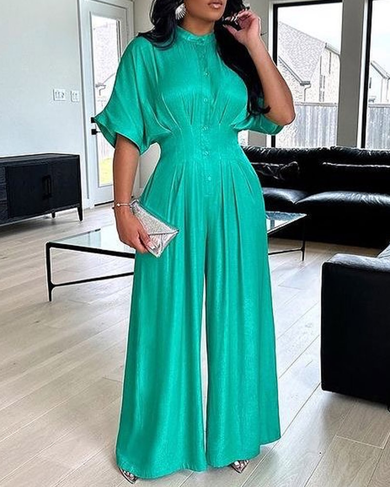 Solid Color Mid-collar High-waisted Wide-leg Pants Jumpsuit
