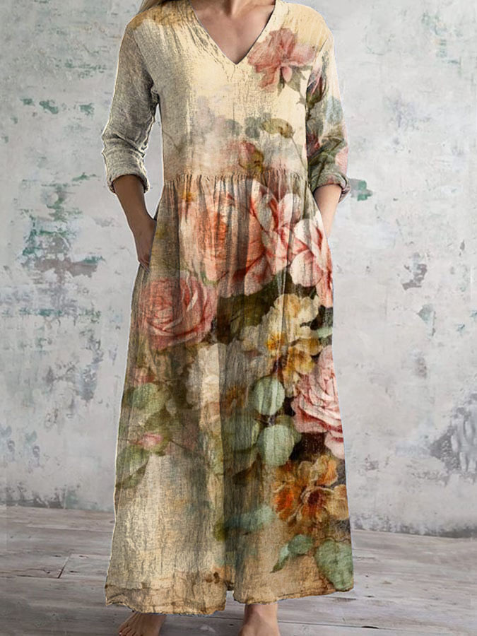Retro Chic Old Floral Print Short Sleeve V Neck Midi Dress
