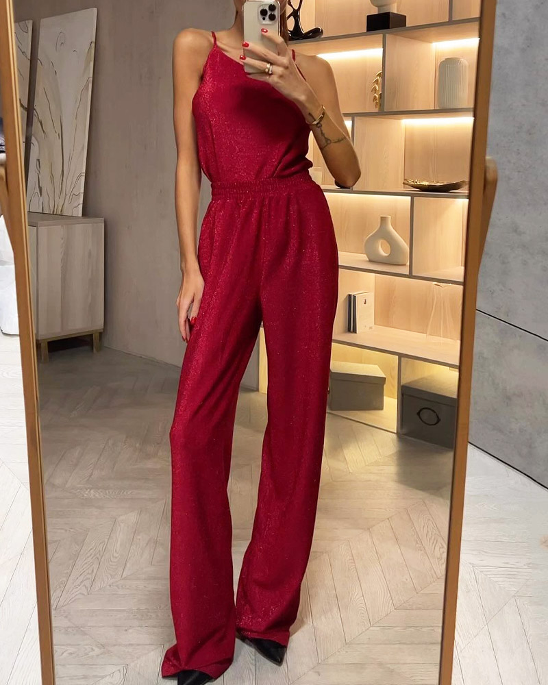 Solid Color Glitter Suspender Top & High-waisted Wide-leg Pants Two-piece Set