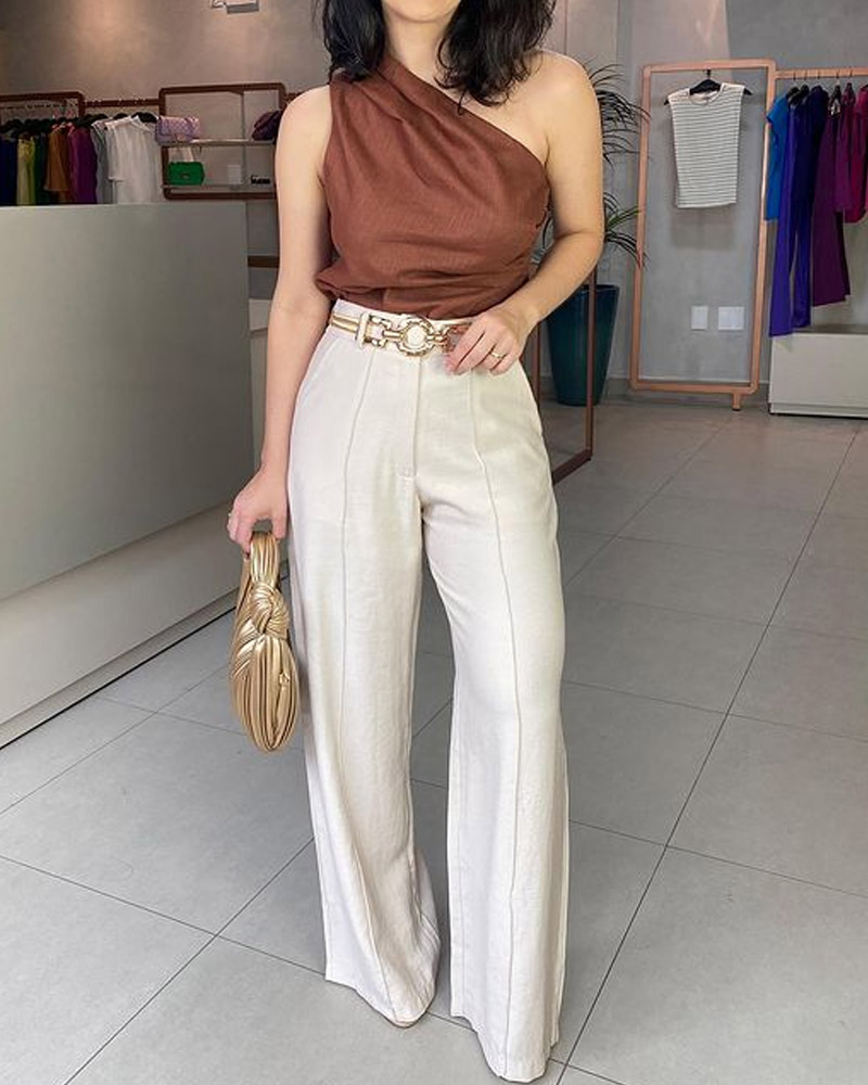Solid Color One-shoulder Top & Wide-leg Pants Two-piece Set