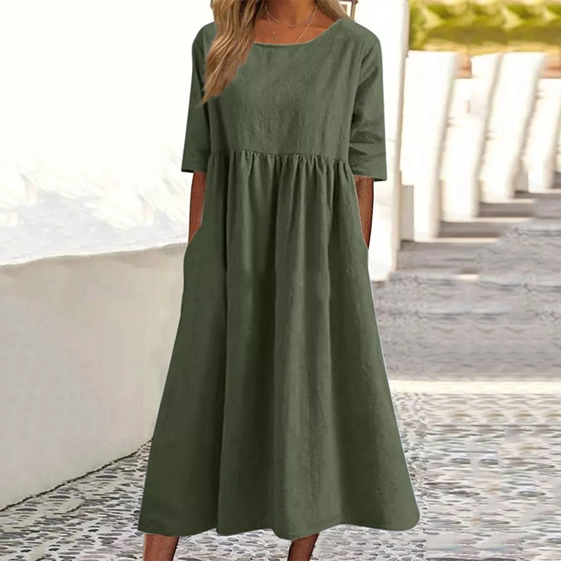 Vintage Plain Pleat Pocket Round Neck Short Sleeve Midi Dress