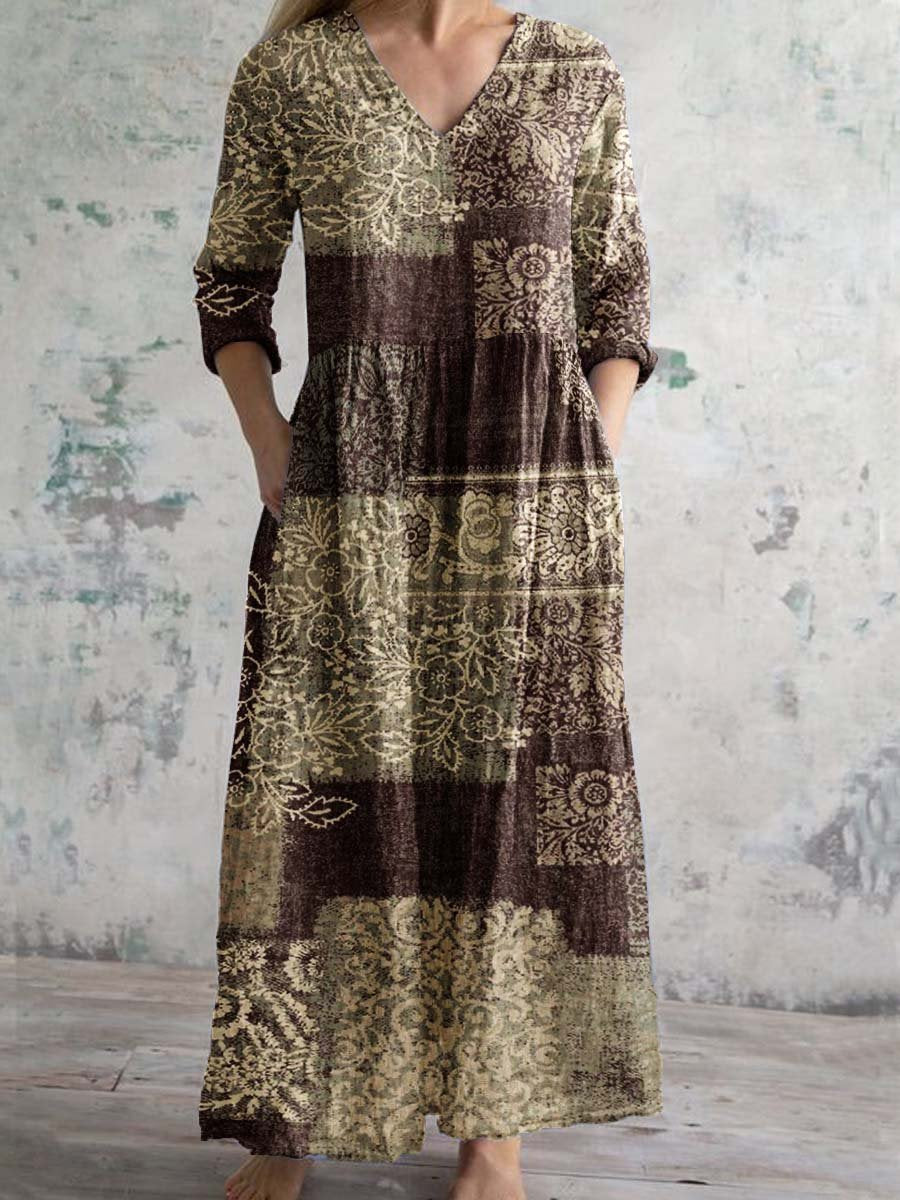 Women's Abstract Art Fluid Pattern V Neck Cotton and Linen Dress With Pockets