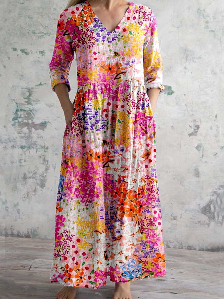Women's Elegant Floral Pattern V-Neck Cotton and Linen Dress