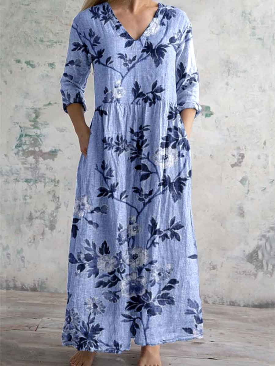 Women's Elegant Ink Painting Floral Pattern Cotton and Linen Dress with Pockets
