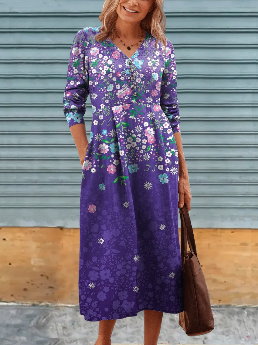 Women's Flowers Pattern Linen Pocket Tunic Dress