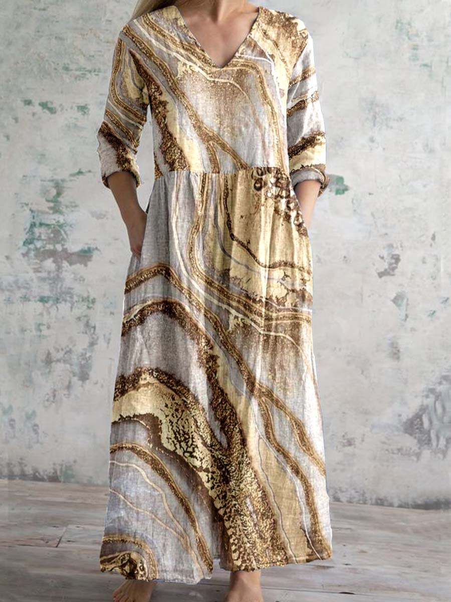 Women's Gilt Artistic V-Neck Cotton And Linen Dress With Pockets