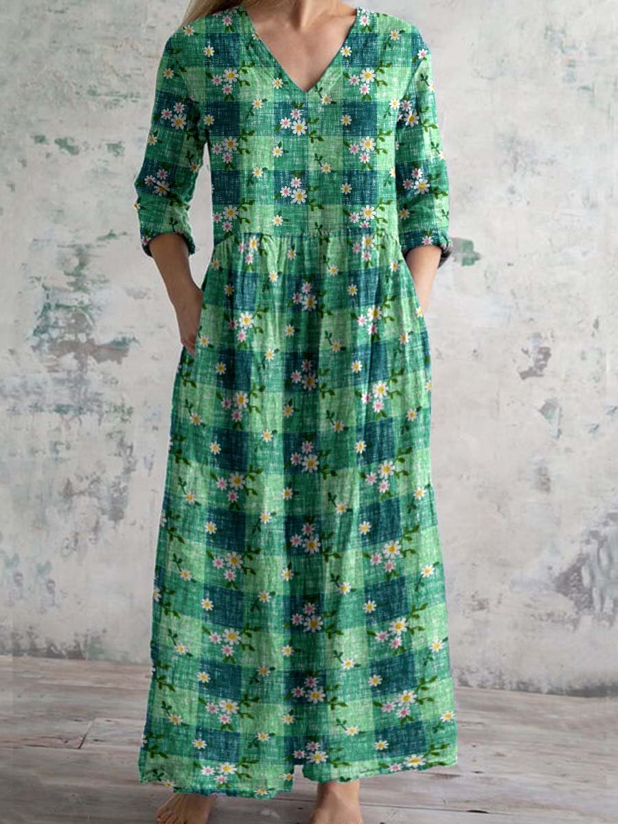 Women's Pastoral Plaid Floral Pattern Cotton and Linen Dress with Pockets