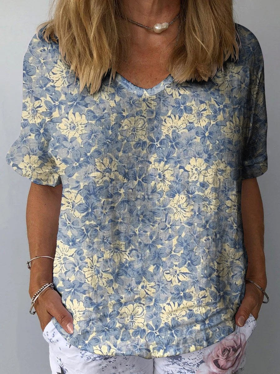 Women's Retro Floral Art Print Casual Cotton And Linen Shirt